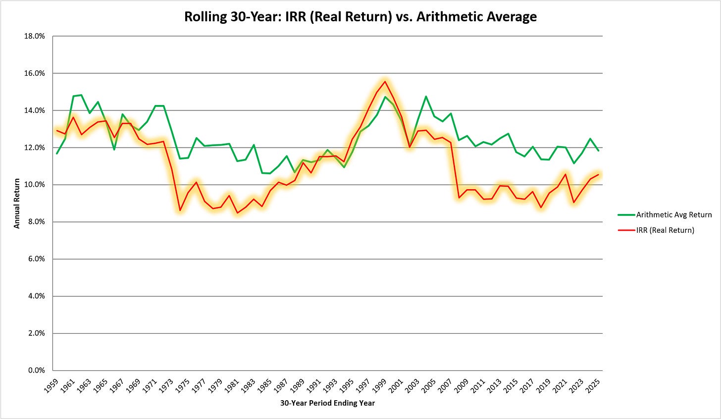 The average return is simply the arithmetic average of the actual rates themselves. This calculation doesn’t have anything to do with the return you’ll actually get. If you go back and look at the entire history of the S&P 500 and look at rolling 30-year periods (1930 to 1959, 1931 to 1960, and so on), there are 67 thirty-year periods. The real return over any of those periods is significantly less than the average return 75% of the time.